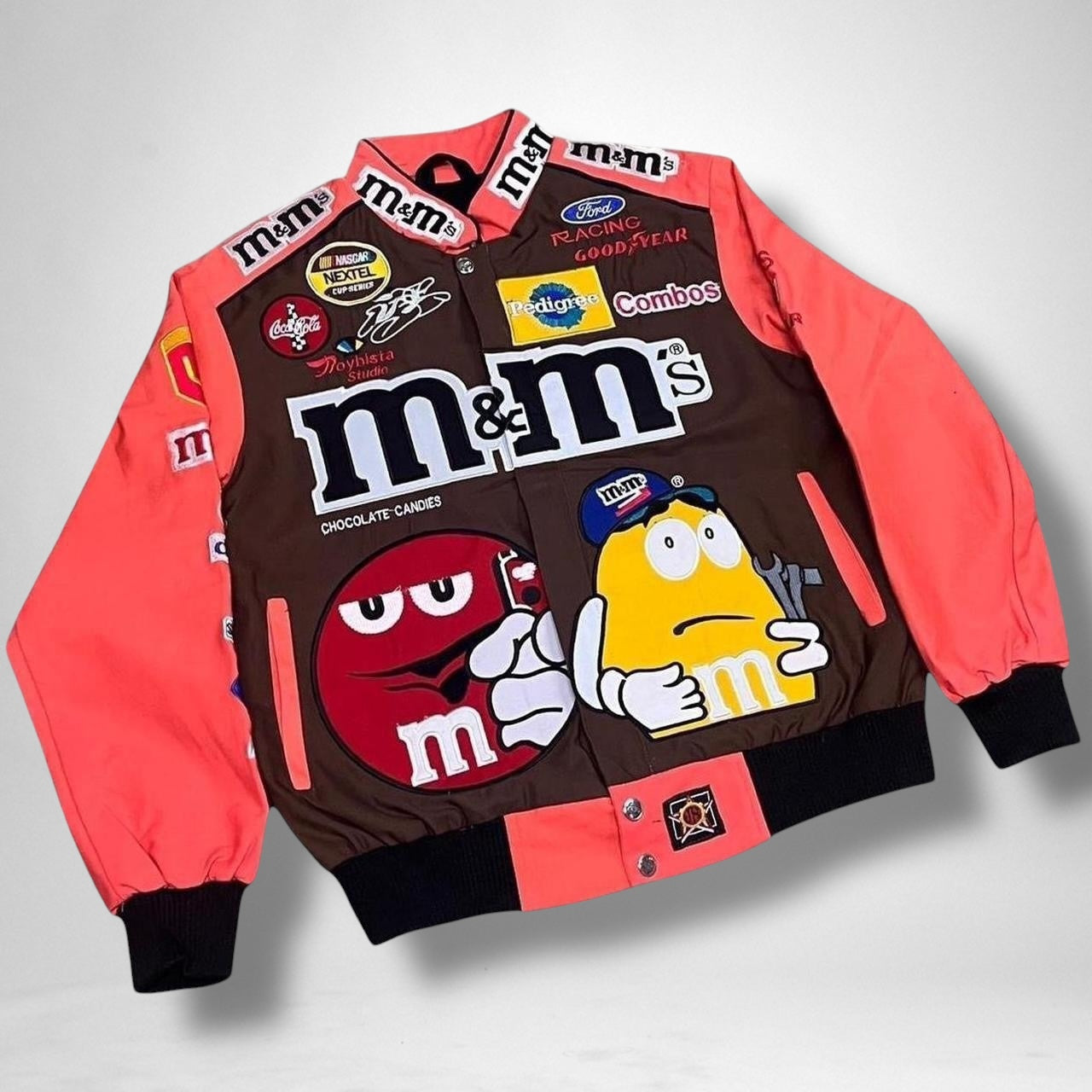 The M&M branding is more than candy—it’s a pop culture moment. Worn by racing legends and embraced by streetwear enthusiasts, this jacket crosses subcultures with ease. The bold colors and playful graphics make it a wearable piece of Americana. It’s more than a jacket—it’s a conversation starter.